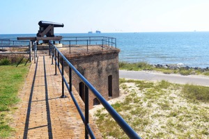 • Dauphin Island Rentals - Fort Gaines Explore the Historic Fort Gaines - The well-preserved ramparts of Fort Gaines have guarded the entrance to Mobile Bay for more than 150 years. Now a historic site, the Fort stands at the eastern tip of Dauphin Island where it commands panoramic views of the bay and the Gulf of Mexico. The Fort was recently designated as one of the Eleven Most Endangered Historic Sites in America due to on-going shoreline erosion