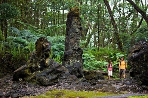 Lava Tree State Park. Because where else do you get a chance to see lava trees? This interesting stop was once a lush rainforest, but in 1970, fast-flowing pahoehoe lava streams hit the wet ohi'a trees and encased the trees and burned the wood inside. The lava covered the trees from bottom to top. As the lava drained away and the moisture inside the trees cooled the lava, a hard exterior shell was formed. The wood inside burned away and only the outside lava shell remained. Each tree has a different shape, and it takes little imagination to see craggy faces staring back at you. Many of the trees are covered in moss; others have fallen to the ground, exposing their interior pipe-like structure. Also, there are some large monkeypod trees here with huge roots, which are equally amazing. These hollow stone lava skeletons are an otherworldly rock forest.