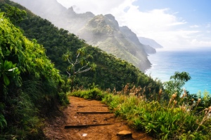 Na Pali Coast State Park - This Wilderness park is in the northwest part of Kauai. It is known for its towering pali, or sea cliffs, punctuated by narrow valleys, streams and cascading waterfalls. The Kalalau Trail is a steep footpath running through the park, between nearby Ke'e Beach and sandy Kalalau Beach. It cuts through 5 valleys, including the Hanakoa Valley, with its native plants and old agricultural terraces. Here you can hike for hours along a meandering seaside path and discover a hidden beach. Waterfalls and swift flowing streams continue to cut these narrow valleys while the sea carves cliffs at their mouths. Extensive stone walled terraces can still be found on the valley bottoms where Hawaiians once lived and cultivated taro. Go kayaking along the shore and see soaring cliffs that rise dramatically from the sea. Other than hiking the coast, the only way to legally access shore areas in Napali Coast State Wilderness Park is by boat.